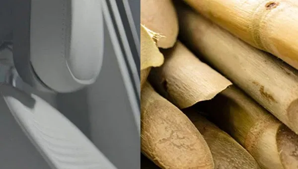 Up to 32 plastic bottles are shredded into plastic chips. These chips are melted and spun into threads that makes an inviting woven upholstery fabric. The fabric made from recycled PET bottles are used on the seats and door armrests.